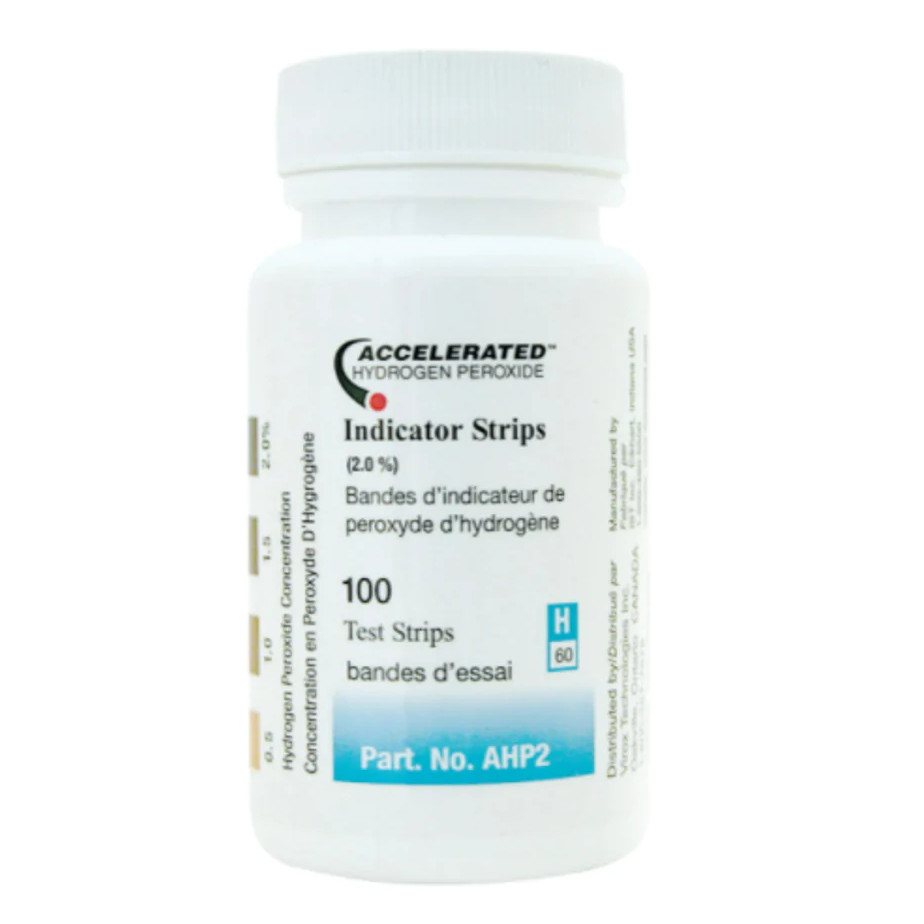 Accelerated Hydrogen Peroxide (AHP) Indicator Test Strips are easy to use dip-and-read reagent strips for a pass or fail determination of hydrogen peroxide concentration in AHP disinfectant solutions for variety of applications (100 Test Strips per Bottle)