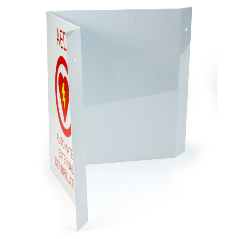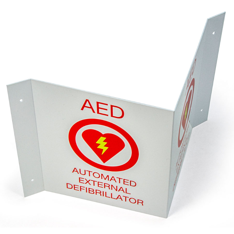 The ZOLL 3-D Wall Sign is a high-visibility, projection-style V-shaped sign designed to clearly mark the location of an AED unit. It is intended to be mounted above or near AED installations (such as the ZOLL AED Plus, AED Pro, or similar units), making the device easier to spot during emergencies.