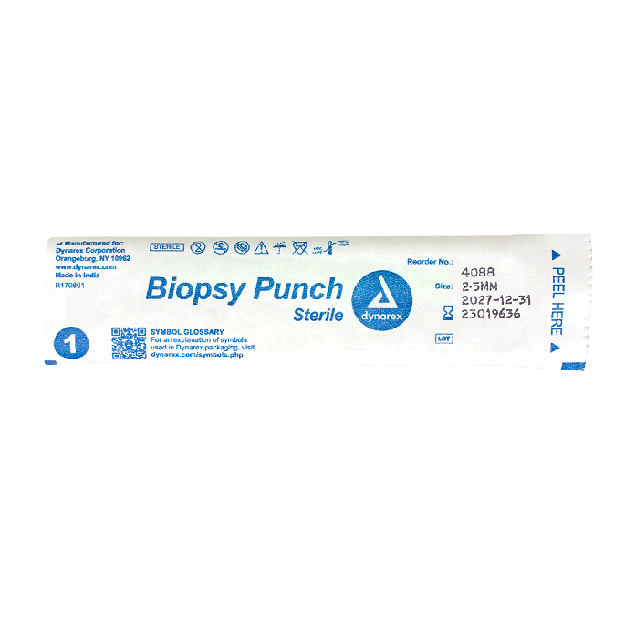 Dynarex Biopsy Punches feature a seamless stainless-steel blade with a durable, ribbed handle, designed to provide greater comfort and control when obtaining tissue samples. (Sold per Each, 25 Each per Box)
