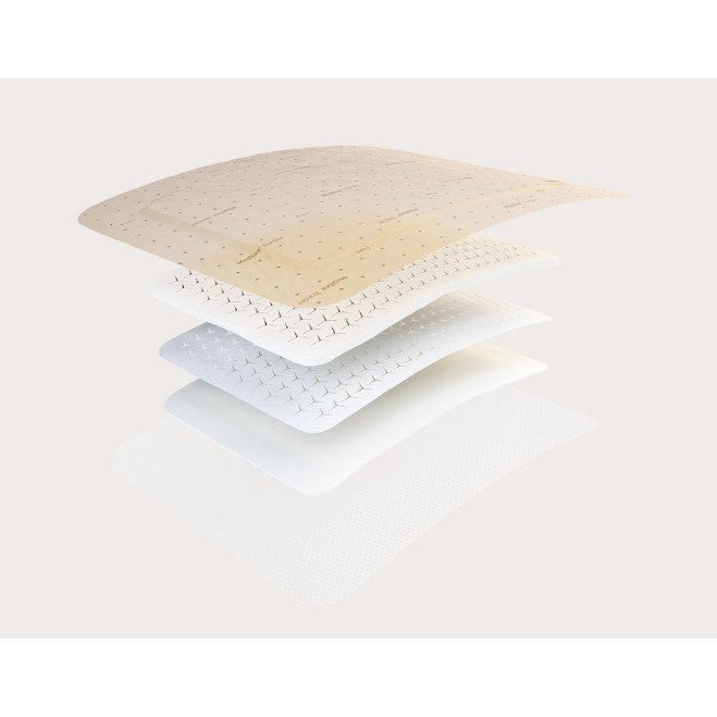 Mepilex Border Flex is a self-adherent, absorbent dressing that maintains a moist wound environment. The waterproof outer layer protects the wound from dirt and bacteria. The dressing has a Safetac® wound contact layer that is a unique adhesive technology. It minimises pain to patients and trauma to wounds and the surrounding skin at dressing removal.