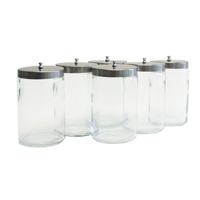 Unlabeled Transparent Glass Jars, Polished Aluminum Covers, Glass, Unlabeled Type, Set of Six (6) 7“H X 4.25“D Unlabeled Flint Glass Sundry Jars with Covers Includes, Reusable, Autoclavable Yes, Grafco Unlabeled Flint Glass Sundry Jars (6 per Case)