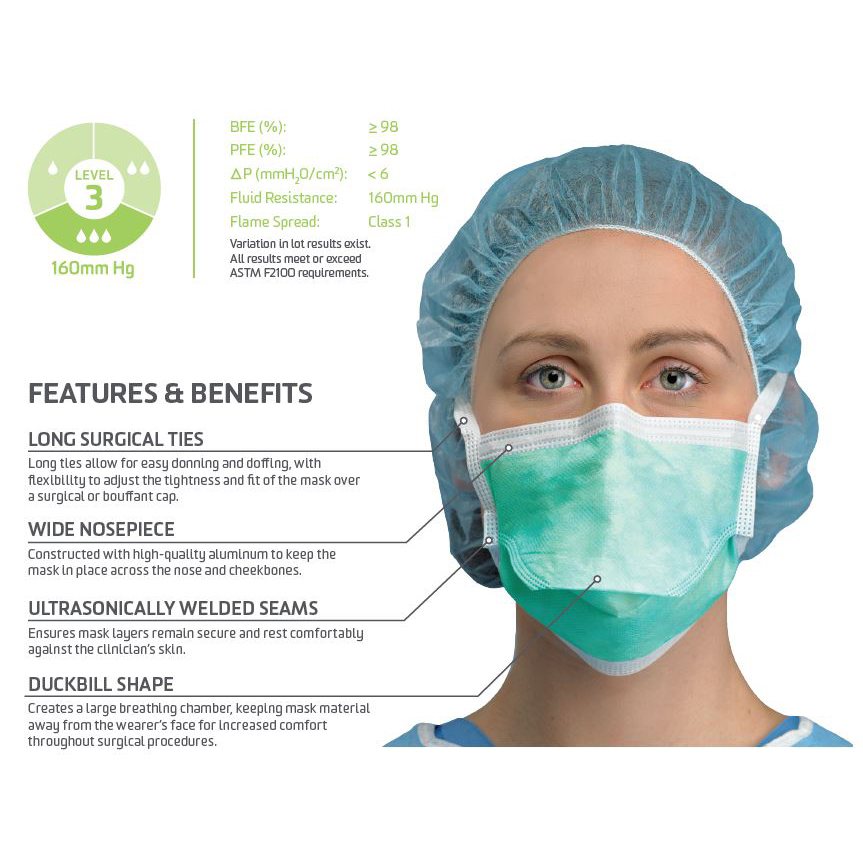 Surgical Ties, ASTM Level 3, Duckbill Shape, Green Color, Aluminum Nose Piece, Fluid Resistance 160mm Hg, Class 1, Latex Free, PRIMED® Duckbill Mask (50 per Box)