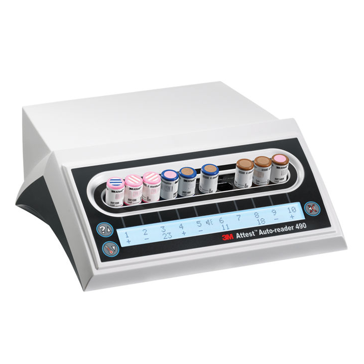 The 3M™ Attest™ Auto reader 490* is designed to incubate and automatically read 3M™ Attest™ Rapid Readout Biological Indicators 1295 for vapourized hydrogen peroxide and 3M™ Attest™ Super Rapid Readout Biological Indicators 1491 and 1492V for steam, at 60°C for a final fluorescent result at 24 minutes. Other biological indicators (BIs) are not compatible with this device and cannot be used.