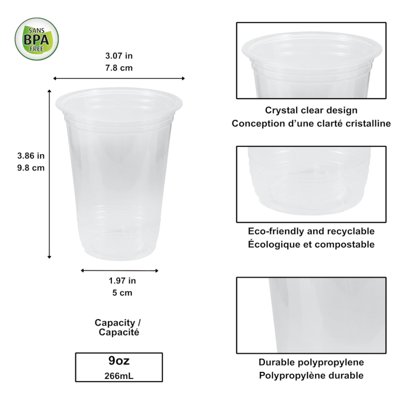 Our transparent polypropylene cups are perfect for any occasion, featuring a 9oz – 266 ml capacity ideal for serving cold beverages like sodas, juices, and iced teas. Lightweight and durable, these disposable cups ensure a comfortable grip with rolled edges and are made from BPA-free, recyclable material. Whether for parties, picnics, or everyday use, these cups offer a convenient and eco-friendly solution for all your beverage needs. 500 per Case