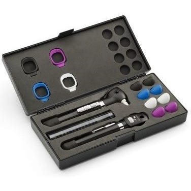 A premium pocket-style LED diagnostic set featuring SureColor™ LED illumination and clinical-grade optics for reliable diagnostic exams. This compact kit pairs a LED otoscope and LED ophthalmoscope with battery handles and a protective hard case.