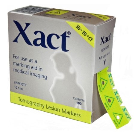 Xact M10TT tomosynthesis lesion markers feature a low-density “see-through” formulation designed especially for 3D tomo. The 10mm equilateral triangular pattern is used to denote a palpable mass. The design includes a central hole through which a Sharpie marking may be applied for later reference. This marker adheres well and conforms very nicely.