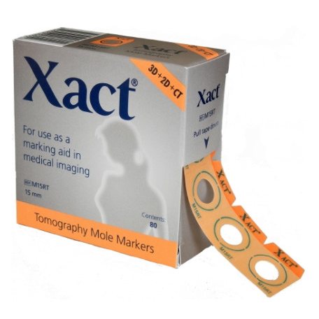 Xact M15RT tomosynthesis mole markers feature a low-density “see-through” formulation designed especially for 3D tomo. The central hole facilitates placement. This marker adheres well and conforms very nicely.