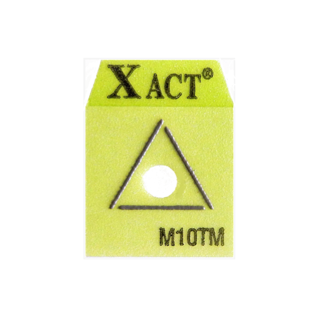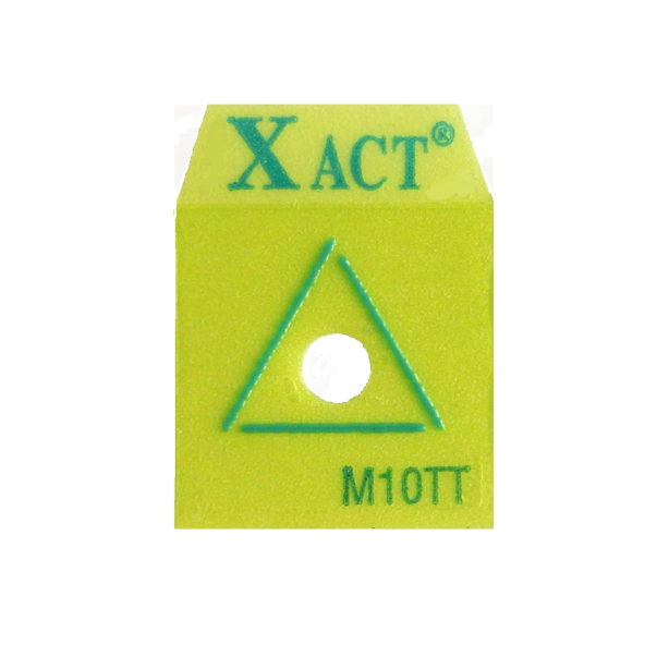 Xact M10TM lesion markers have a 10mm equilateral triangular pattern often used to denote a palpable mass. The design includes a central hole through which a Sharpie marking may be applied for later reference.