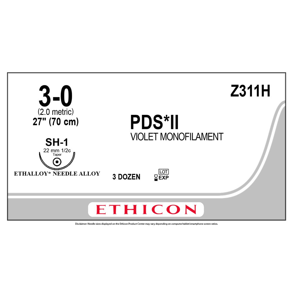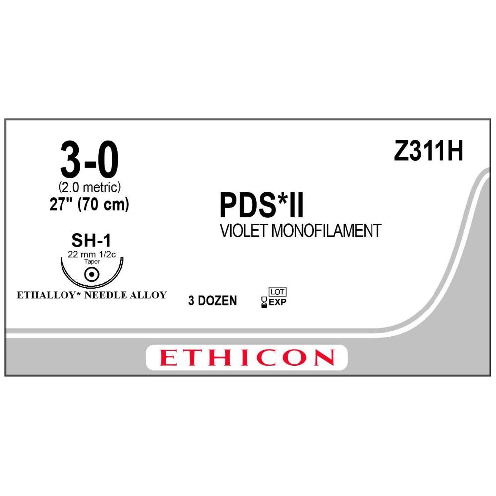 Size 3-0, 27 in Length, Voilet, No Control, For Wound Closure Applications, Polydioxanone Material, Absorbable, 182 to 238 Days Absorption Rate, Unidirectional Directionality, Pledget No, Pledget Size NA, SH-1 Needle Name, Silver Needle Color, 22 mm Needle Length, 1 Strands Per Pack, 1 × 27 in Pack Strand/Length, Taper Point Needle Point Type, 1/2 Circle Needle Shape, Sterile, PDS® II Absorbable Polydioxanone Suture 36 per Box