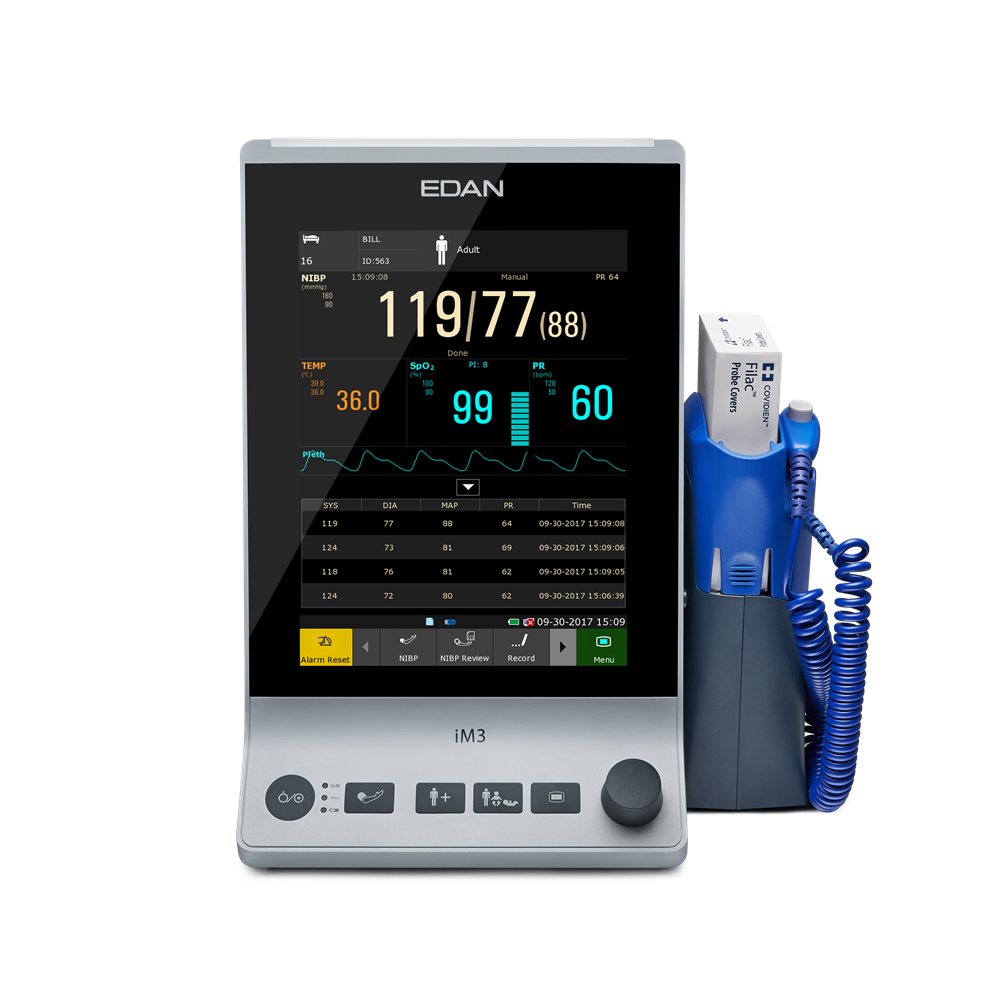 The Edan iM3 Vital Signs Monitor is a sleek, ultra-slim bedside and cart-mount monitor designed for spot, rounding, or continuous vital-sign checks. Featuring an 8? capacitive touch screen, a 360° visual alarm, and support for NIBP and SpO2 (with optional modules), it streamlines monitoring in wards, clinics, or ambulatory settings.