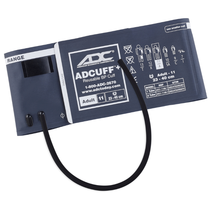 The Adcuff+ model with one tube can be used with most palm aneroids and many NIBP monitors, and features our all-new, one-piece, reusable nylon blood pressure cuff.