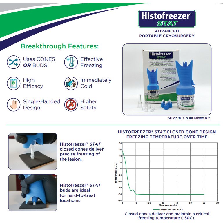 Histofreezer® STAT works with cones or buds, making it easy to customize the treatment based on the patients needs. Both treatment options deliver a colder treatment which result in better first-time outcomes. Sold per Each