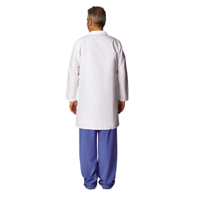 Size No 38, 30 in Length, White, 80% Poplin Polyester, 20% Cotton, Left Chest Pocket, Two lower pocket Pocket Type, Three Button Front Closure Type, Men’s Gender, Latex-Free Yes, Consultation Lab Coats Sold per Each