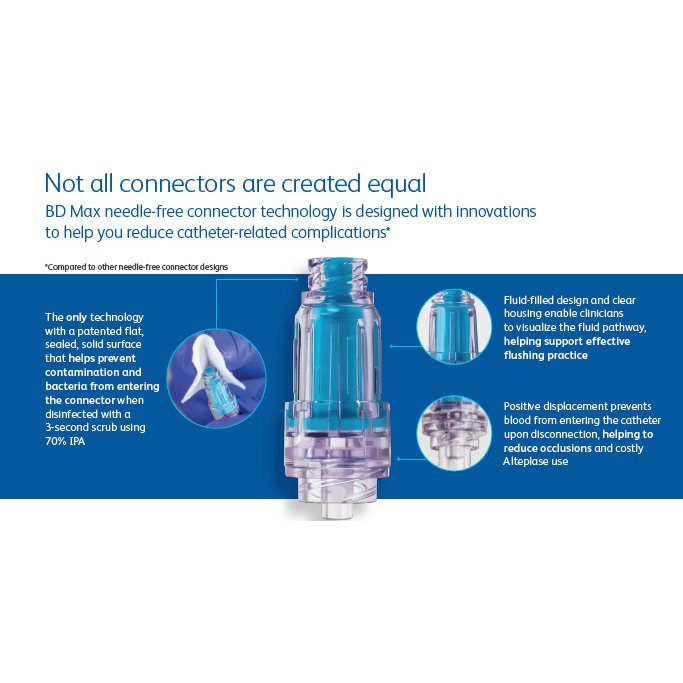 The MaxZero™ Needle-free Connector provides a solid, sealed and flat surface which provides a barrier to contamination with just a 3-second scrub. In a retrospective observational study of 720 home infusion patients, the BD MaxZero™ Needle-free Connector reduced PICC occlusion rates by 55.1% (p=0.001), compared to a leading neutral displacement connector. The clear housing and fluid-filled design enables clinicians to visualize the fluid pathway 100 per Case