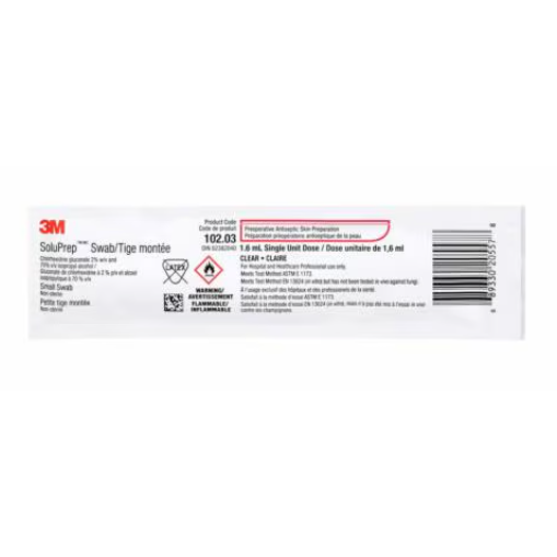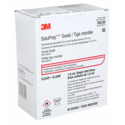 3M™ SoluPrep™ Swab is a clear solution of 2% w/v chlorhexidine gluconate (CHG) and 70% v/v isopropyl alcohol (IPA). Indicated for skin antisepsis prior to invasive procedures, this product helps reduce bacteria on skin to diminish the risk of surgical site infection.