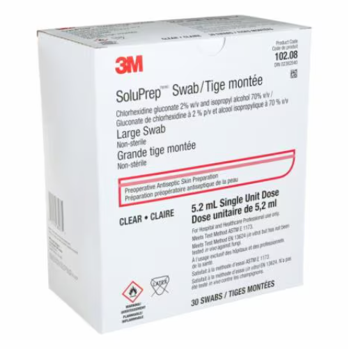 3M™ SoluPrep™ Swab is a clear solution of 2% w/v chlorhexidine gluconate (CHG) and 70% v/v isopropyl alcohol (IPA). Indicated for skin antisepsis prior to invasive procedures, this product helps reduce bacteria on skin to diminish the risk of surgical site infection.