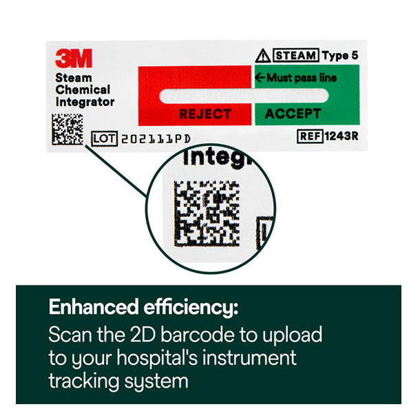 The 3M Comply SteriGage 1243E is a steam chemical integrator (Class 5) engineered to monitor and validate sterilization conditions inside packs during saturated steam sterilization cycles (121-135 °C / 250-275 °F). It is a lead-free, moving-front indicator with an attached extender strip that simplifies retrieval from inner packs.