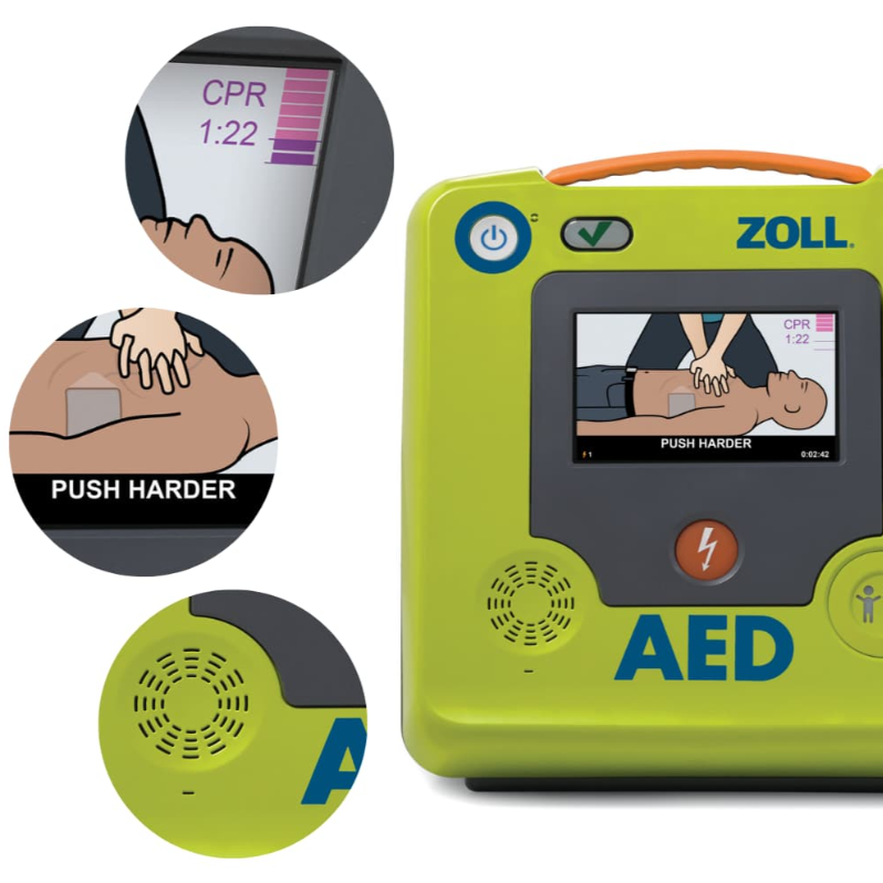 The ZOLL AED 3® defibrillator features real-time CPR feedback, full-color rescue images, RapidShock™ analysis technology, and an integrated child mode, making it simple to treat both adult and pediatric victims of SCA. Designed with readiness in mind, ZOLL AED 3 includes long-life consumables and optional WiFi connectivity for remote monitoring of the AED’s status.